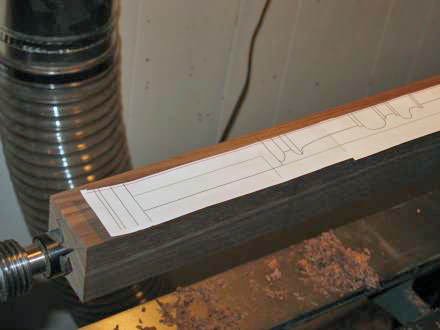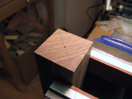 A 1:1 plan was used to mark out the edges of the square portion, and the lines extended around the four sides of the blank so that they are more visible when spinning - one can be just seen below in the center of the spinning-wood shot. The end of the square portions were then cut, and the anti-klutz corners added.