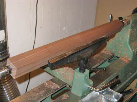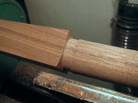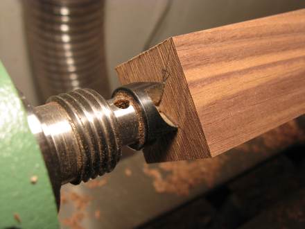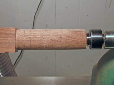 To fabricate the legs, the center of the blank was marked at both ends to help guide the spur center and the tailstock centers when mounting in the lathe. Marking a reference on the spur center end of the wood is usually a good idea too since if the piece rotates for any reason (such as a nasty catch), then it can be rotated back to the original orientation, which can sometimes make a bit of difference in centering.