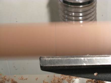 Each edge was then cut using a 90 degree V-gouge (also sometimes confusingly called a parting tool). This formed the dips between the rope turns. Straight and skew chisels were used to extend this V-cut to the edges of the bead where it was too tight to use the V-gouge.