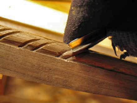 Each groove was then rounded using the V-gouge and skew chisels. When done, the grooves were cleaned up a bit with a 60 degree skew chisel. The photo below shows an edge being trimmed with the gouge, held in the ratty gloves I wore to protect against incidental cuts. The ragged finger was probably a result of the gloves' heroic self-sacrifice in a hazardous power-sanding situation.