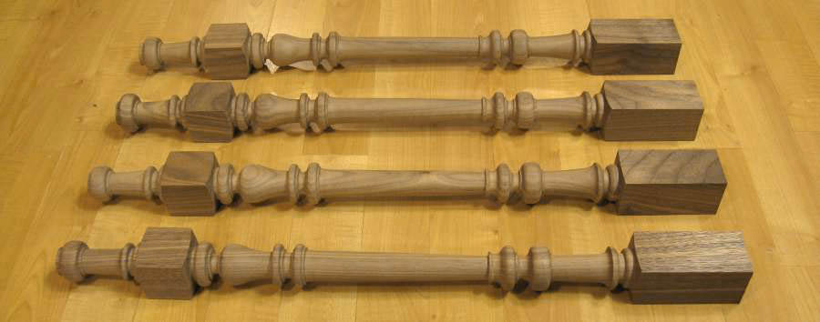 The four legs can be seen below after trimming to equal lengths. While the slight differences in the individual shapes of the legs are painfully obvious to the turner, they don't look too bad separated by a foot or two at the corners of the table.