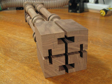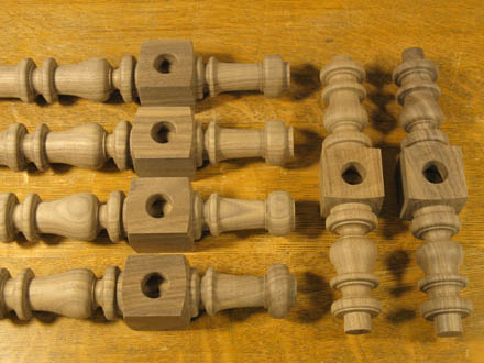 The process that I had the most problems with was forming the ends of the square sections where they transition to round. Perhaps it was the type of wood I was using, but I had a great deal of trouble doing this with a clean edge. Even using a technique from a video tutorial on how to do it did not seem to work for me. Yah, must have been the wood. However, I finally managed to come up with a technique that worked consistently with my wood, my tools and my skill level. When it looked like I had the technique settled, I started on a new piece of wood to gain consistency, and after numerous successful ends, I was ready to proceed.