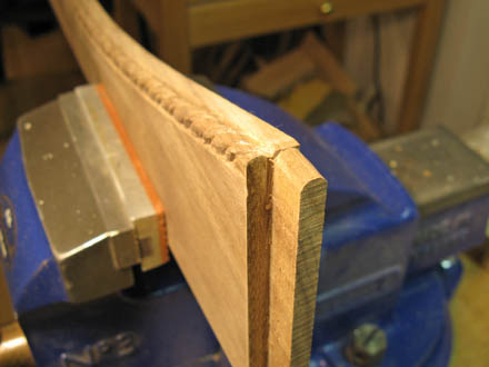 However, since the skirts have square bottoms while the ends of the mortises are round, one or the other had to be changed to fit. Rounding the skirt ends (tenons) seemed like a better choice. One of the side skirts can be seen in the vise after having the bottom end of the tenon modified to be round.