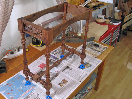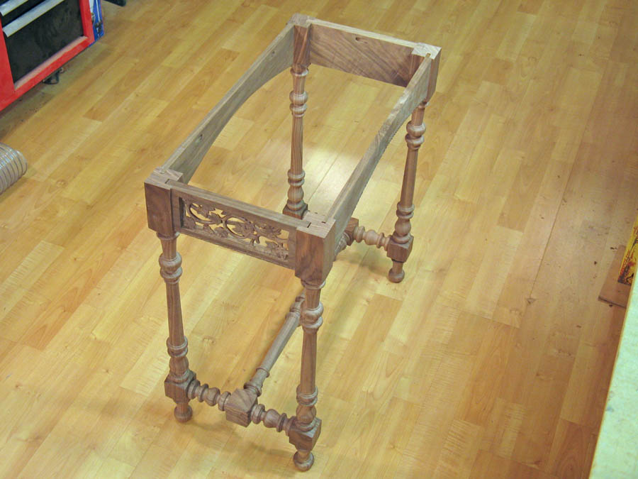 The two ends were then assembled with the side skirts and the middle stretcher, with the result being shown below. The frame ended up being pretty square, so there was no problem with flatness when the top was put on.