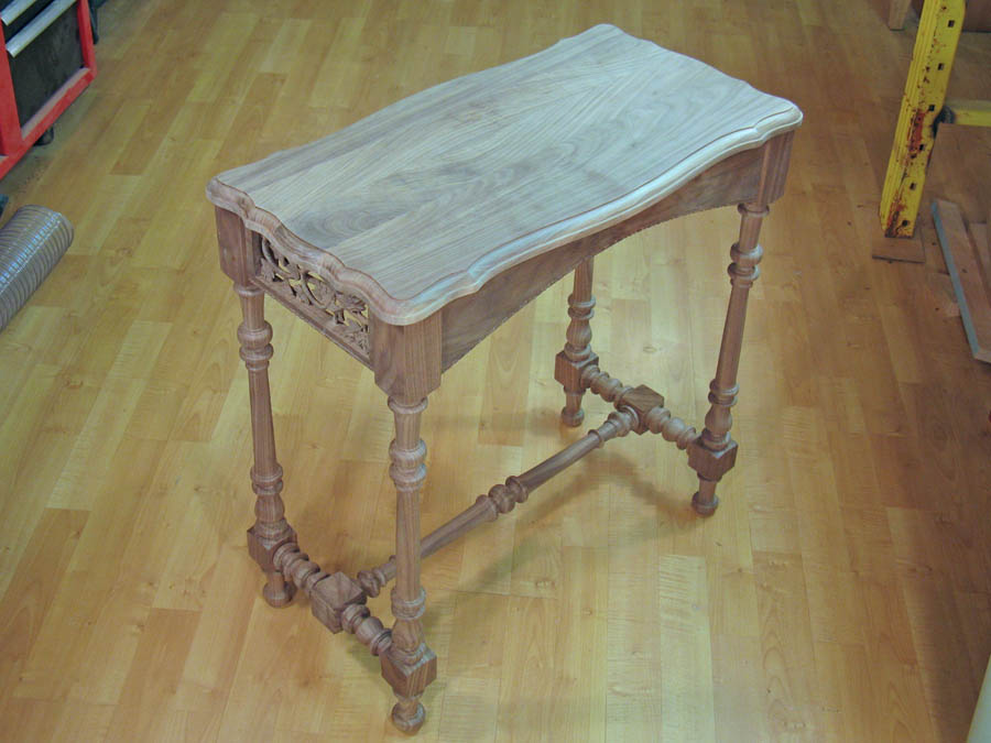 When one collects antiques, it is not unusual to have mismatched pieces, and in fact many might consider that part of their charm. Therefore when one makes pieces in an antique style, it is probably safe to ignore the matching aspect as well. So of course, this table looks like nothing else we own, and I felt I had free rein to make it look however I wanted. The design was based loosely on an antique (or at least oldish) side table we had picked up in a Regina antique shop years back. When all was said and done, the only actual similarities are the style of the top, the height, and the type of wood.