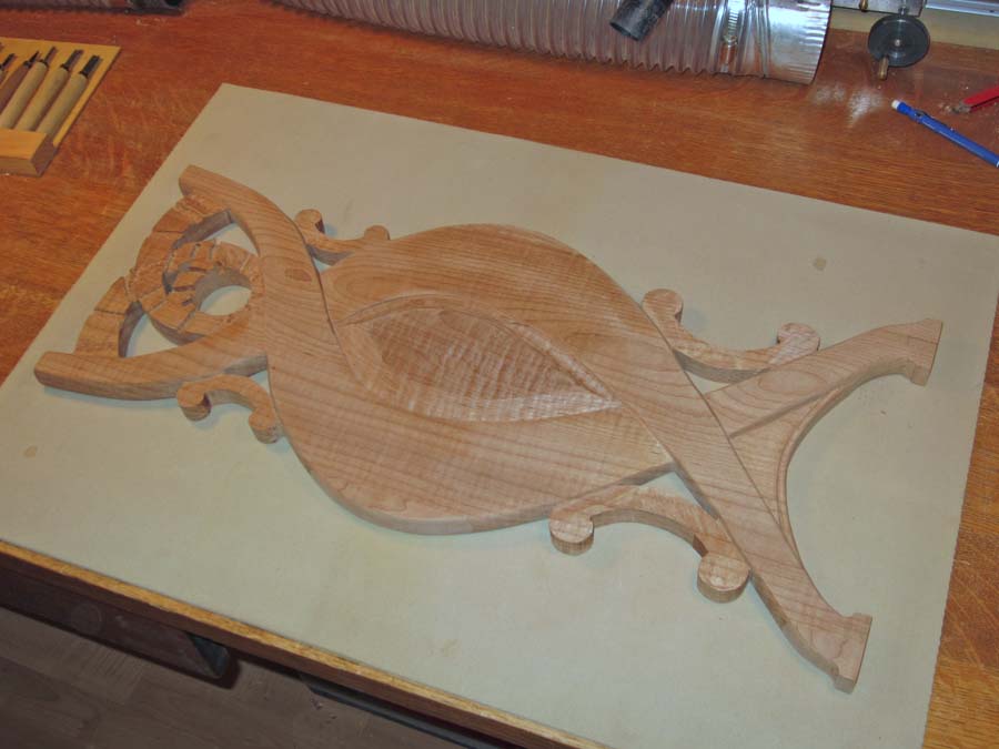 I didn't put any carving detail on the flip side of the ends. All the corners are rounded to match the main side, but the none of the surface detail is there. The scrolls are just delineated with narrow slots. That "B side", however, has routed slots to accept the magazine rack sides and bottom, although there is no photographic evidence to back up this particular assertion. The shot below is one of the ends with the carving complete except for the center detail.