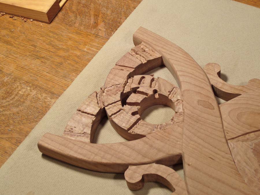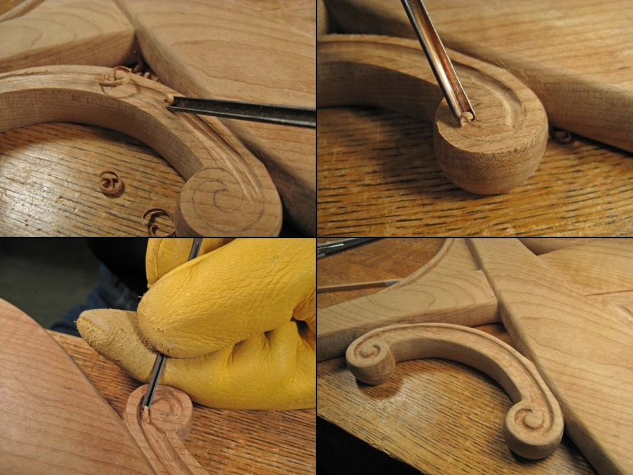 The "scrolls" first had their sides rounded in a similar manner to the main body, although they didn't get the radiused corners. Then the "showy" side of the end had the scrolly parts carved in. Below is a little montage of the scroll carving. That was just carved by hand as shown, and then, yes, sanded.