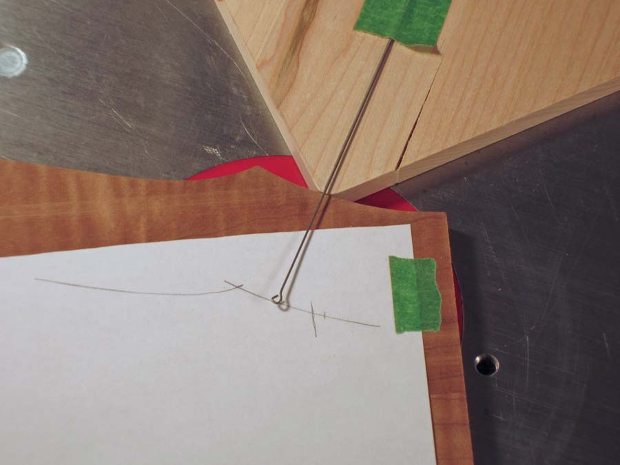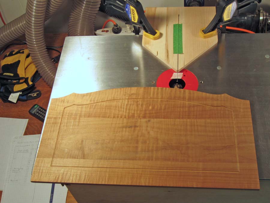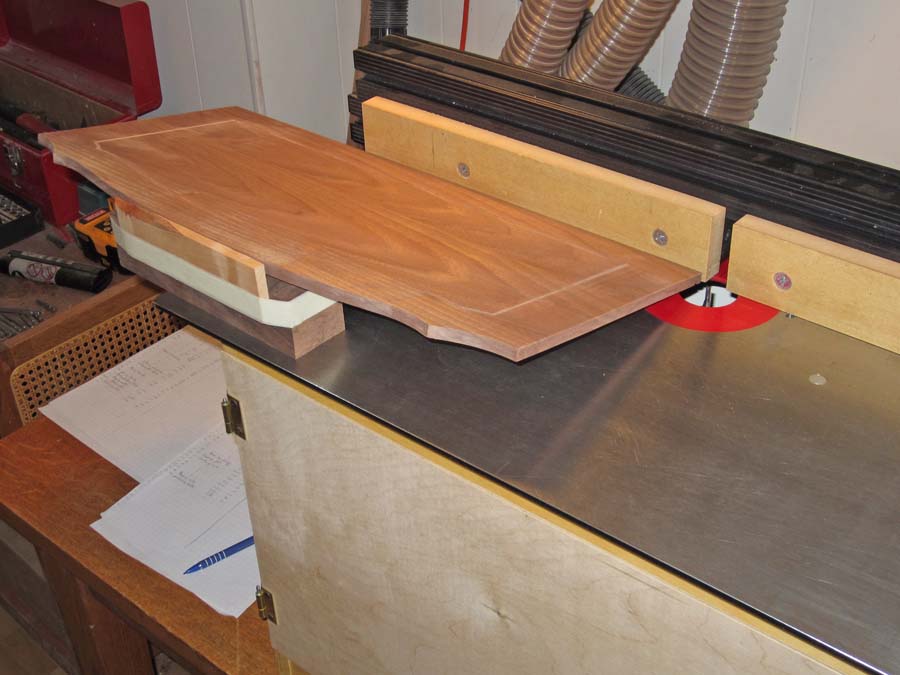 The side walls of the magazine rack were panels about 1/3" thick. A taller center panel is flat on both sides, but the two outside panels were to have a flute (a round groove) echoing the edge profile. I made the grooves using the router in an effort to make smooth curves. The wooden jig shown below is sometimes called birds-beak guide, and it keeps the edge of the wood a measured distance from the router bit. I added a wire loop, which is positioned just over the router bit to provide an indication of exactly where a cut is being made on the other side, so that intersecting routed segments of the groove can be stopped at the correct spots. To make the grooves, I taped a sheet of paper to the panel (just to have better contrast) and marked the corner areas where three grooves intersect. I then routed each segment using the wire as a guide on the pattern to judge when to end each segment.