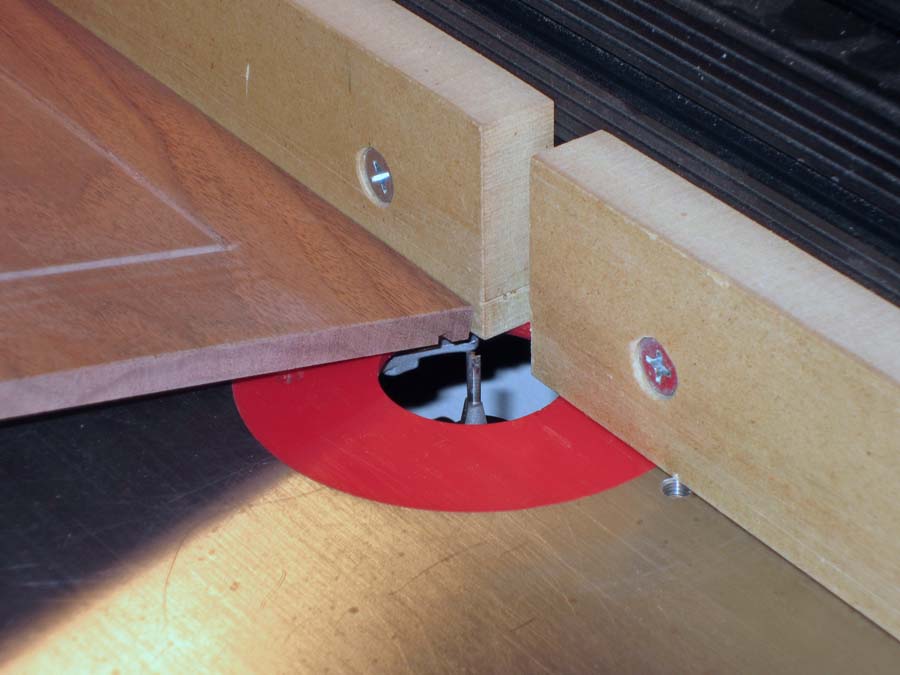 The shot below shows the setup for cutting the angled slot in the sides. The sharp-eyed may notice the rather more walnutty look of the wood in the panel shown, and this is due to it being for another table that I was making at the same time.