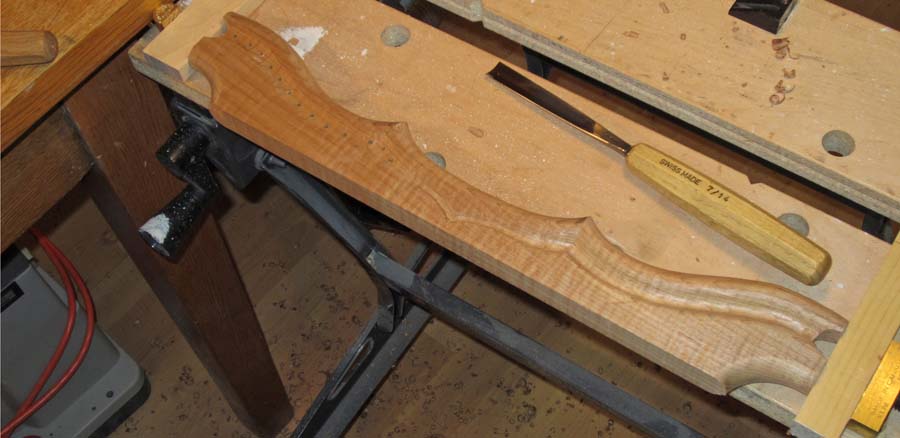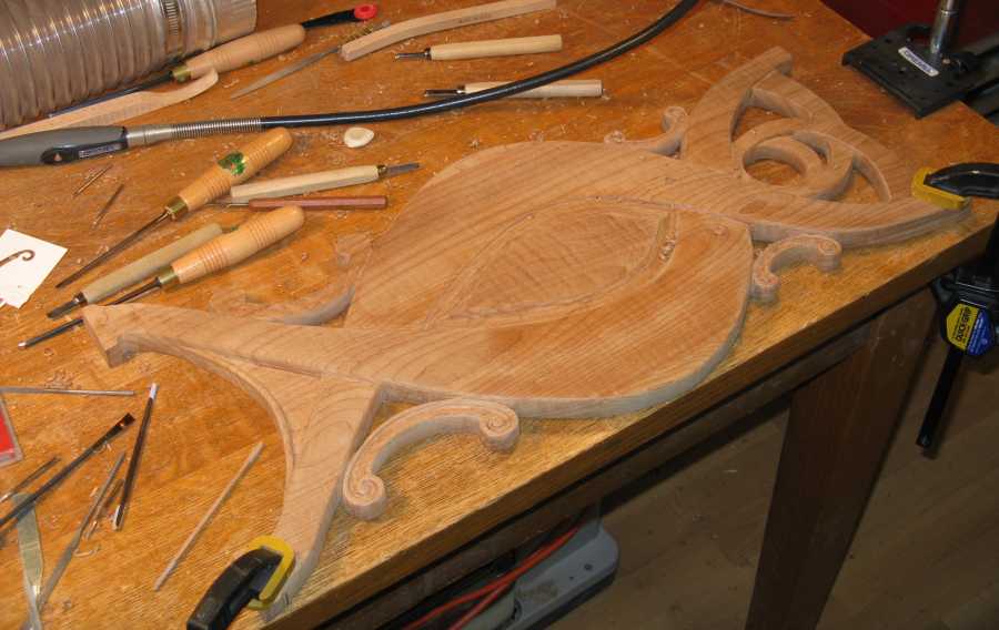 This piece was held in an old Workmate with the help of some "bench dog" style clamps that fit into the holes in the top. This worked out reasonably well except the Workmate isn't very rigid - especially side-to-side - and tends to wobble when lateral pressure is applied, as it was for carving this piece. I braced it against the nearby table and usually held it with one foot for more stability when carving.