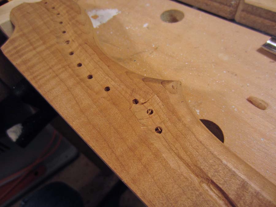 The holes on the left-hand side were drilled with a flat-bottomed bit to act as depth guides to ensure I had the desired depths along the groove.
