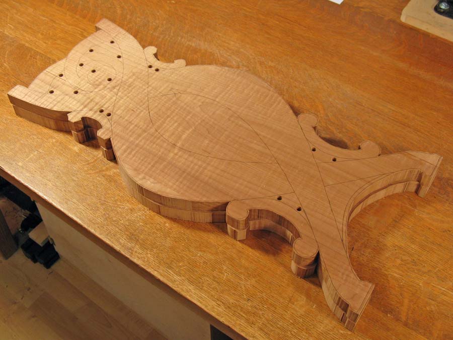 The pattern for the main contour can be seen in the photo below. The main outside shape has been roughed out with a bandsaw, and I've drilled holes for insertion of a saber saw blade to cut out the required through-holes.