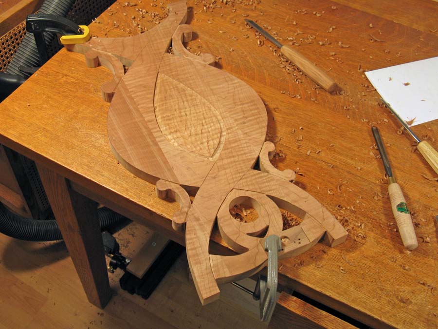 The web fits under the top and spans between the two ends. It probably isn't necessary for strength since the magazine rack walls provide lots of stiffness to the table, but it fills an otherwise empty span between the ends. This piece was shaped with my normal method of bandsaw and spindle sander, and then the outside edges were routed to a semi-circular profile. The inner profiles were carved by hand as shown. The right side has been completed, and the left side is partially done in the shot below.