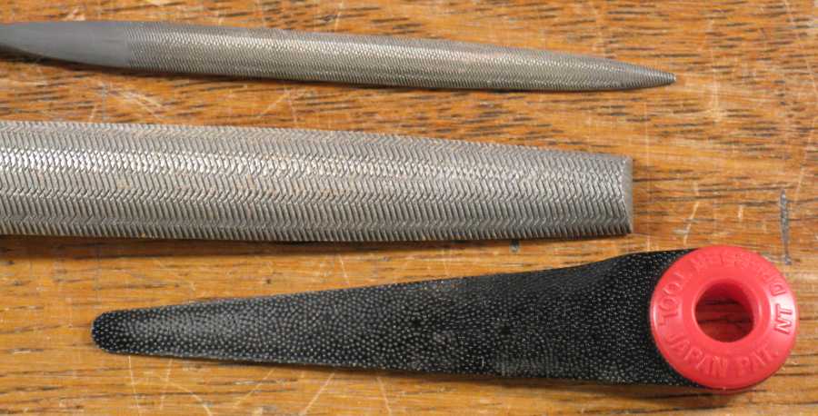 The sides were roughed with the flat side of a half-round file. That file was coarse enough to cut fairly aggressively, and fit better into the triangular holes than a rectangular-sectioned file would. The tapered shape also helped it get closer into the corners. One tool that I found quite handy was a curved and tapered Japanese finger file, which is an odd little stainless steel file with "safe" edges., that was very effective for working into corners. I also used finer files and sandpaper strips for clean-up.