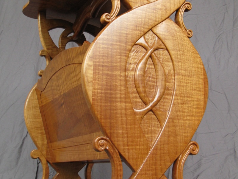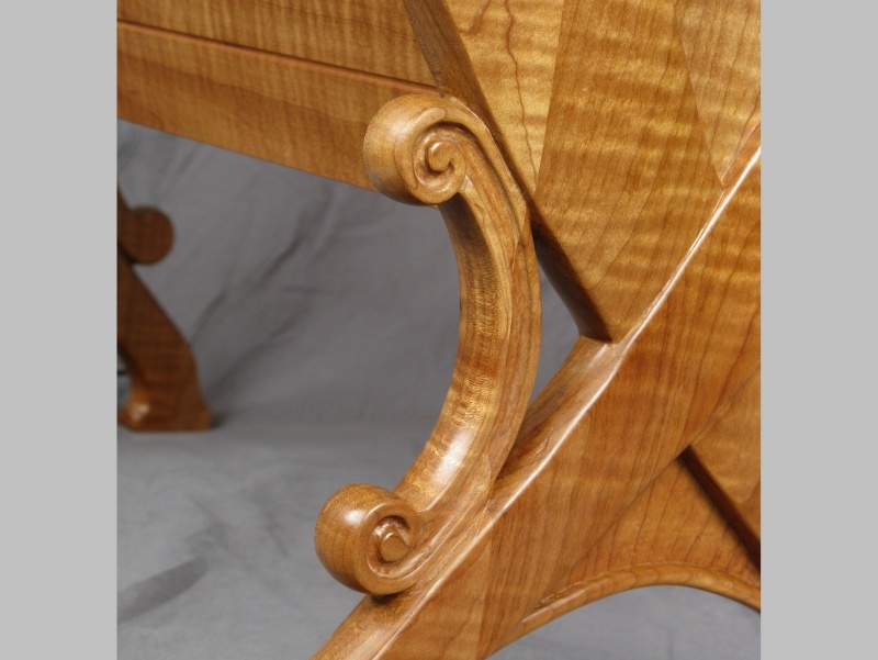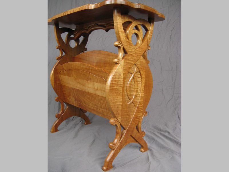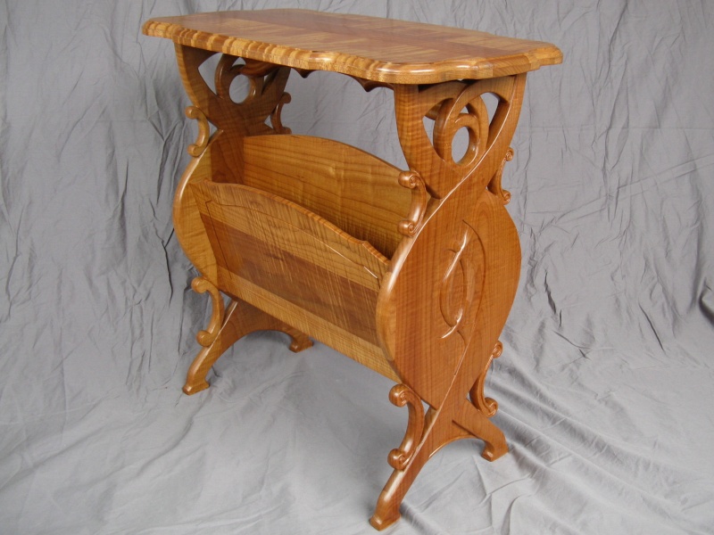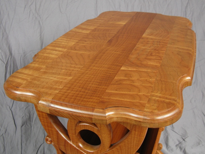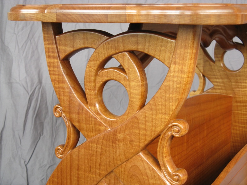 the look that results from laminating wood for a thicker leg. Based on this, the design uses a flat end with integral feet. The profile is shaped into a crossing pattern with scroll figures in the notches, and a center pattern with a crossing motif. This is made as a magazine table, with spaces for magazines or books on both sides. The top is a laminated plank design with edge shaping, in keeping with the other side tables we have.
