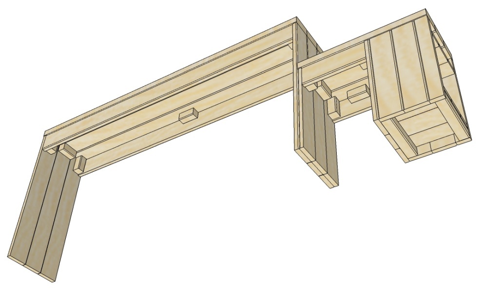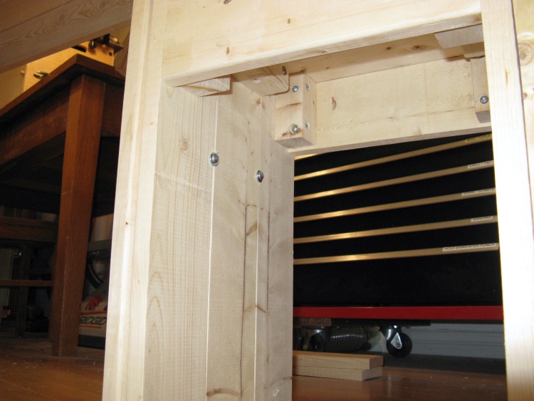 In this photo, the legs are mounted and the block to affix one of the skirts is being screwed down.