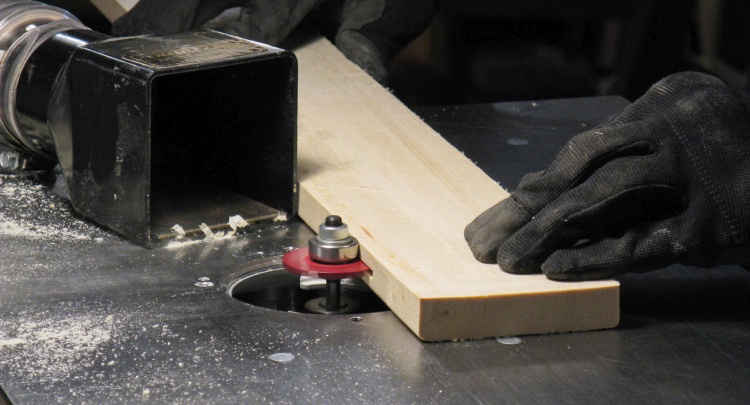 Virtually all the table pieces consist of three adjacent widths of boards so I decided to laminate them using joinery biscuits. Those require a slot which I cut on the router table.