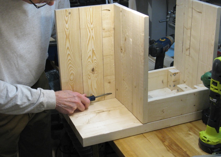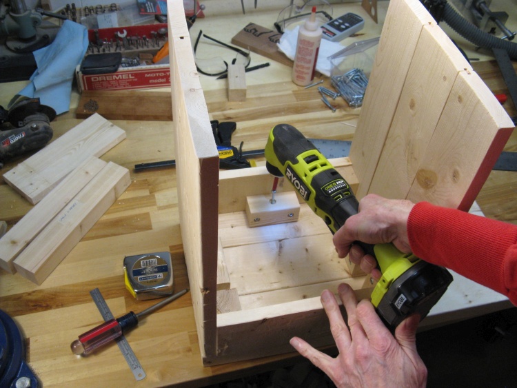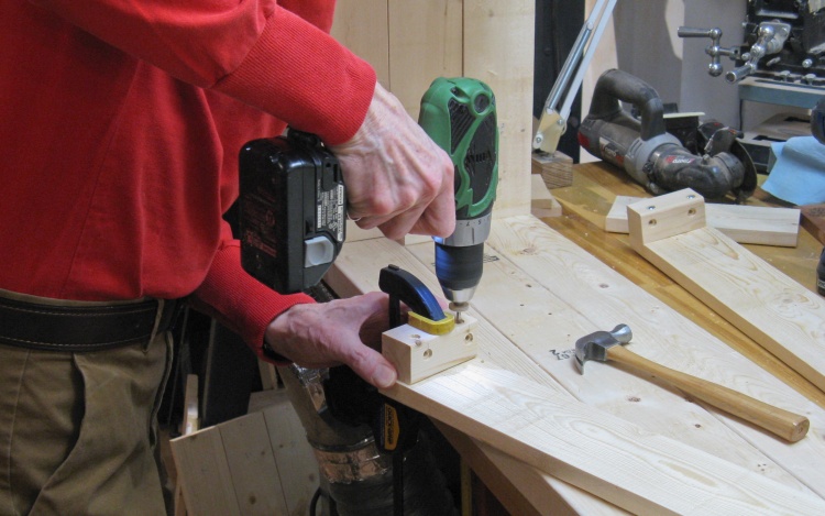 I obviously didn't want the big assembly blocks in the bookshelf area so instead I used a pocket screw approach for the walls. I used the normal pan-head screws but first drilled a hole at 15° into the wood using a jig. That provided a hidden attachment that didn't intrude on the shelf space.