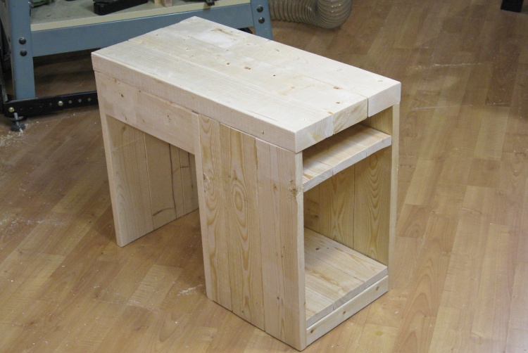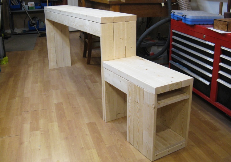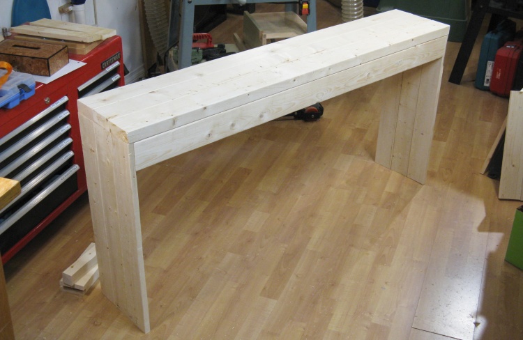 At this point the tall table section (upside-down on the bench) is in the midst of assembly.