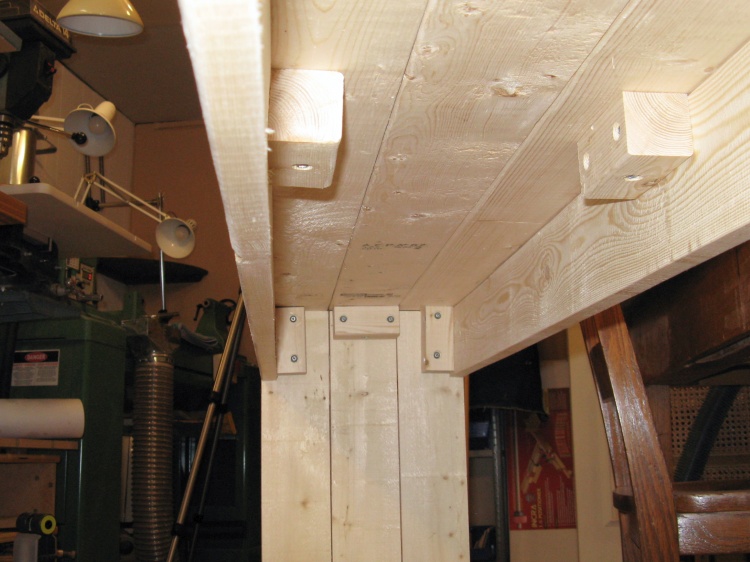 I first tried making a pair of thin brackets that slid between adjacent boards and were locked in place with a tapered rod fed through a wire loop, but that didn't end up being rubust enough.