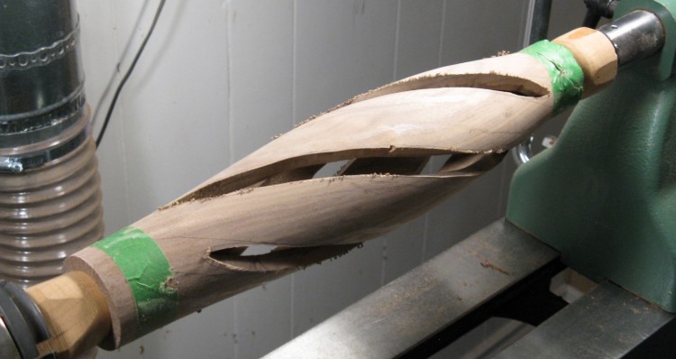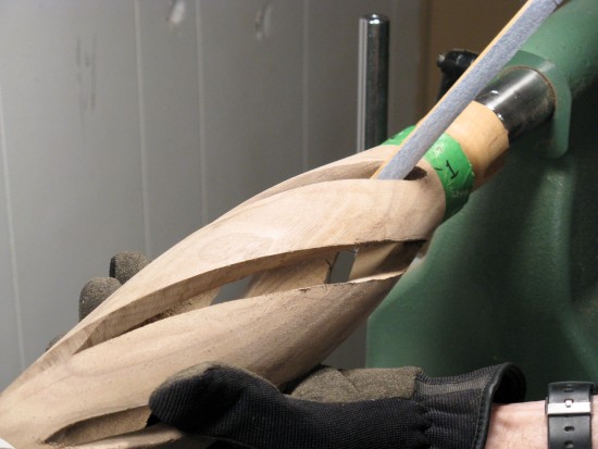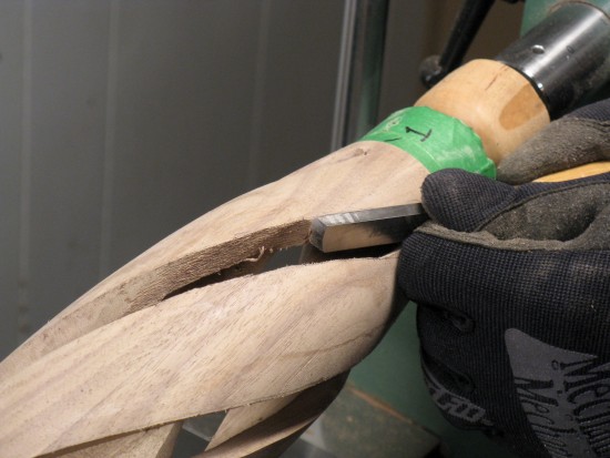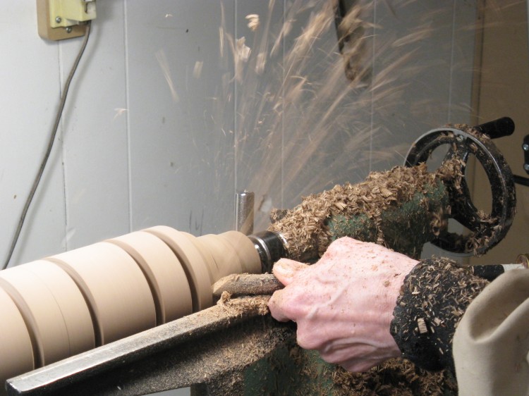 Here's an action shot of some of the shaping using a bowl gouge. It can remove wood pretty quickly as suggested by the chip fountain in the photo.