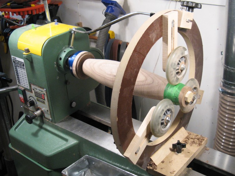 Next I looked at hollowing the body. For this, I pulled of the tailstock and added the steady rest to be able to get at the end. The green tape holds down a thin plastic strip wrapped around the wood to prevent damage from the wheels.