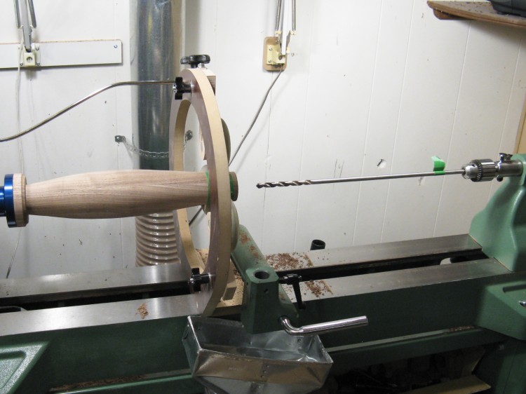In hollowing something like a vase, the depth of the drill hole would mark the inside depth. However, this one will be hollow through and through, so I used my longest drill bit to be able to drill right through the other end. The blue faceplate has a hole in the center to accommodate this.