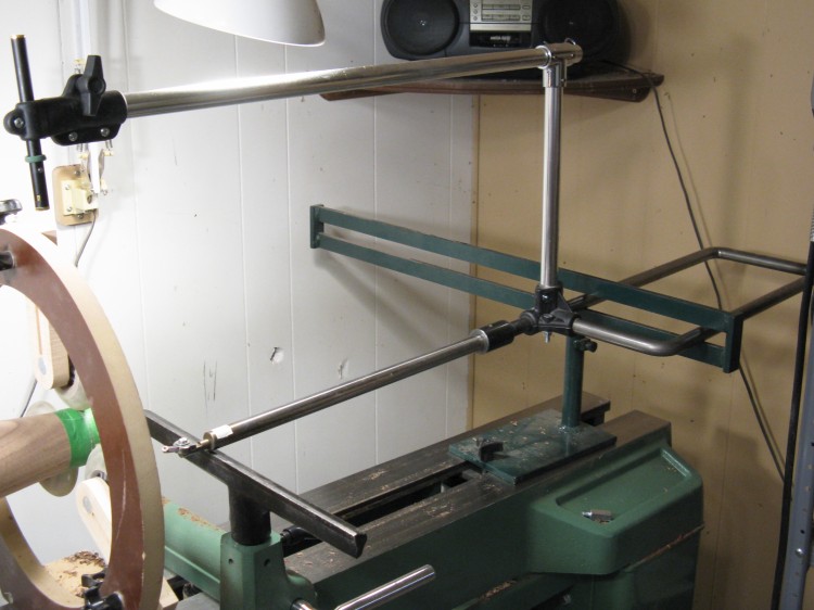 Here's a shot of the hollowing tool I usually use, with the little cutter sitting on the tool rest and the laser that marks its position on the separate arm overhead.