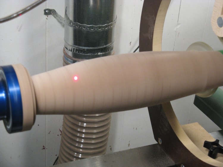 Here I'm standing past the right side of the photo guiding the hollowing jig. The laser spot corresponds to the position of the cutter so you can see that it is most of the way to the bottom.