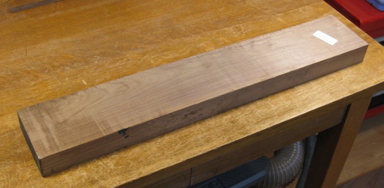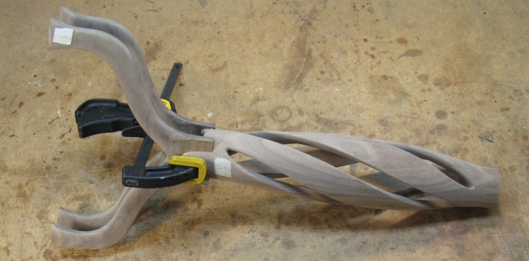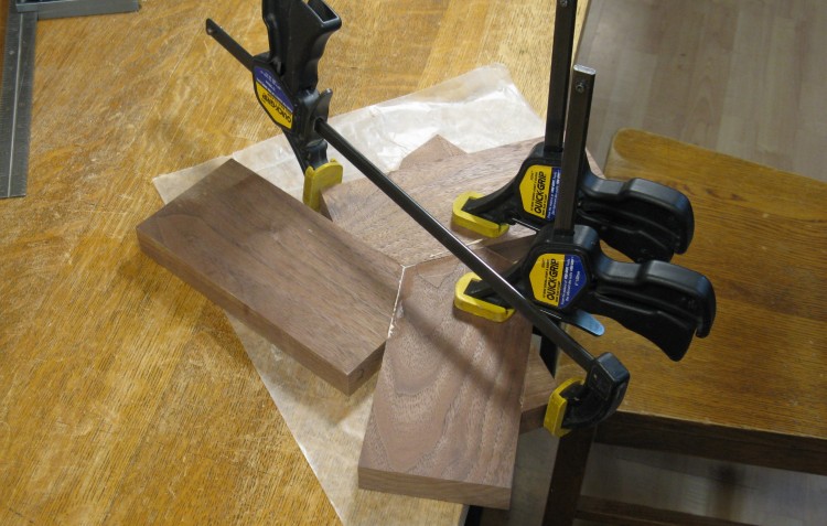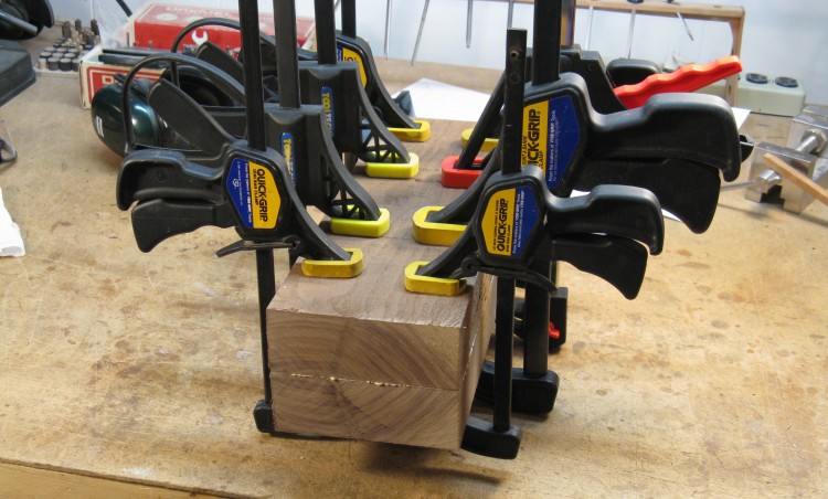 After jointing the facing sides to flatten them, the two pieces were glued together, shown here being clamped while the glue sets.