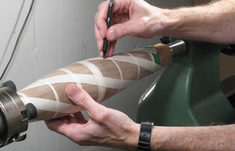 The spiral pattern of the cutouts was established using good ol' masking tape. First the narrow pieces were added and marked evenly around the circumference for accurate positioning, then the pattern pieces were wrapped using the marks as a guide.