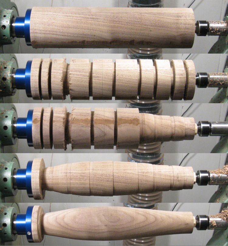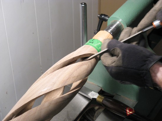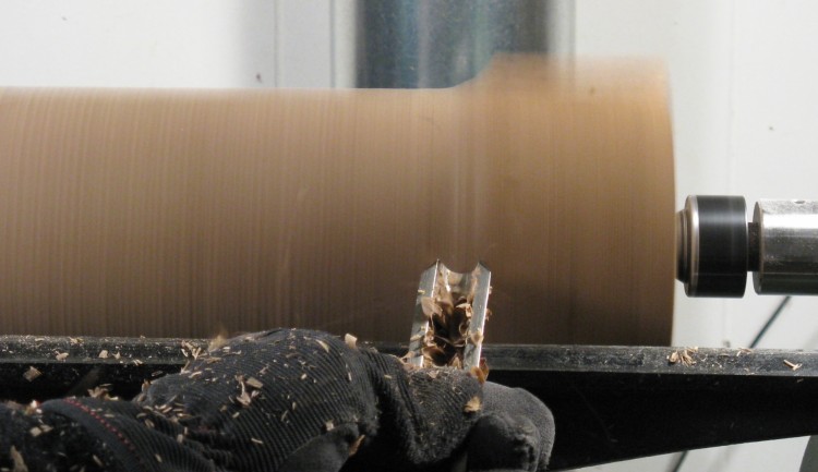 The roughing gouge was used to round off the blank. This process generates lots of chips and the gouge directs them upwards and outwards. I always need to vaccuum and sweep after doing the roughing stage since the floor is covered in wood chips all around the lathe.