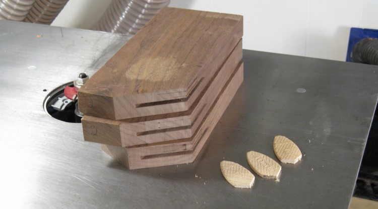 I decided to make the base from three separate pieces for a more symmetrical look. Here the pieces have been cut out oversized and slots added to accept the biscuit joint reinforcements.