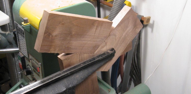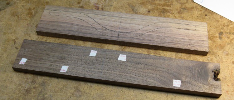 Here one rail has been marked on a properly-thick piece of walnut, and the second is ready to be taped to it so both can be shaped at the same time like was done with the arms.