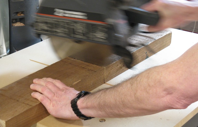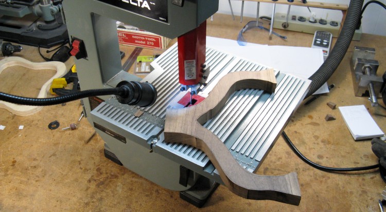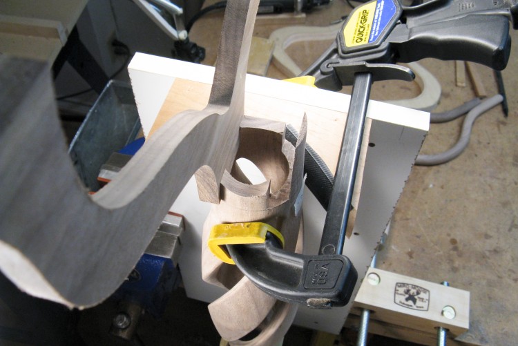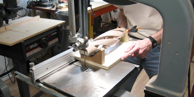 The jig was made to hold the body horizontal and parallel to the bandsaw fence. In this photo, the top of the body will be cut to accept the arms.