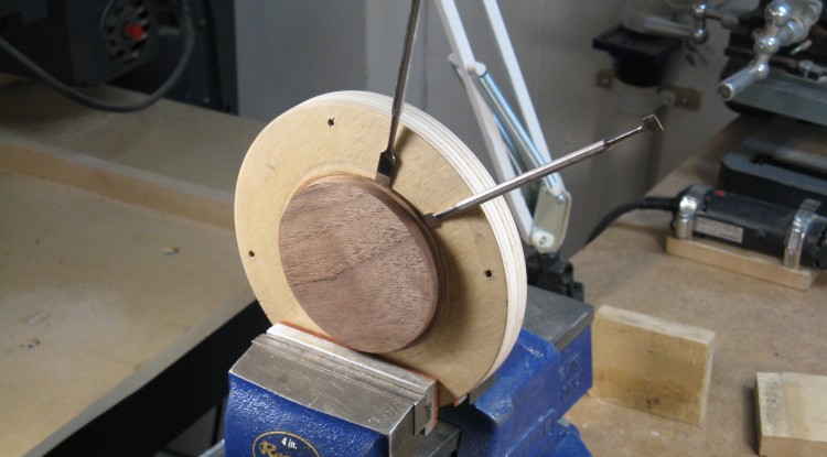 I thought the best way to do that was to cut a round hole and fill it with a round plug. Here the base has been mounted on the lathe in preparation for cutting the hole.