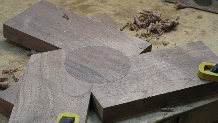 I started with the body, which seemed like it would be the most involved part. It needed a 4"-square piece to start with, which came from laminating two 2" pieces.