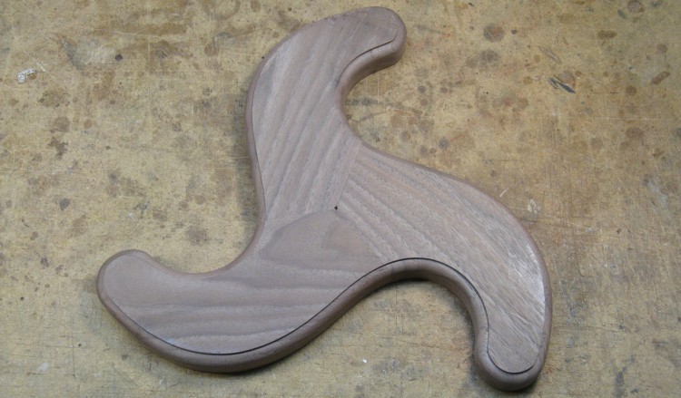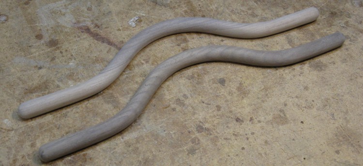 Two layers of wood were taped together so both arms could be made at the same time. Here they've just been cut out on a small bandsaw.