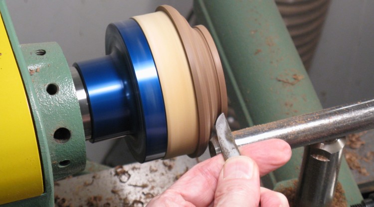 The plinth sits on the base to support the body. It's a pretty straightforward turning and is shown almost completed in this photo. Here I'm completing the final shape using a tool I made for just this cut.