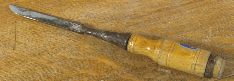 I needed an acute undercut angle for the plinth and didn't see any good way of doing it with standard tools, so I made a custom-shaped scraper out of an old battered chisel, shown here. I used it once and then was done. Tho' in fact I've used it a few times since due to its handy angle so it wasn't as much of a one-shot as I'd expected.