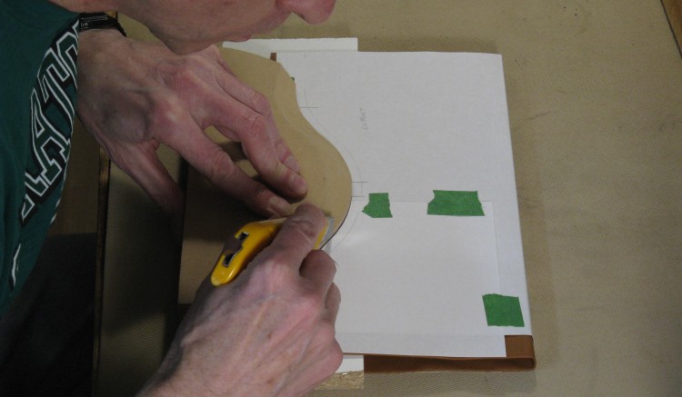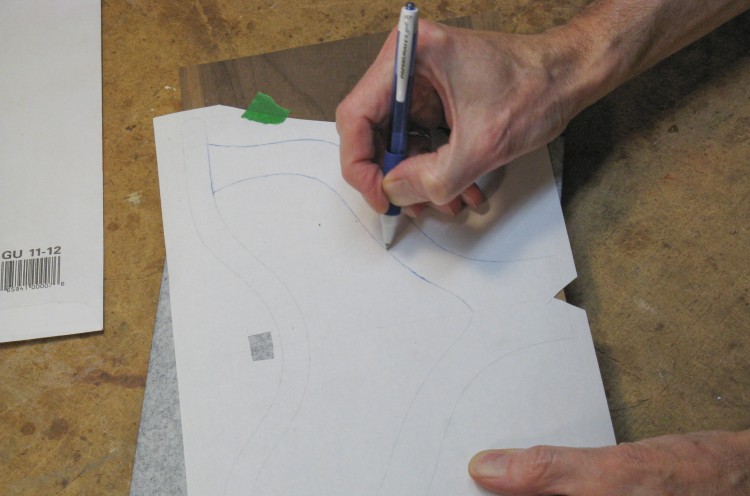 This shot shows the pattern being transferred to the wood by tracing the outline of the tape with a pencil.