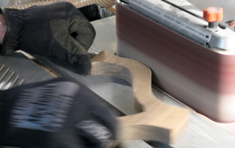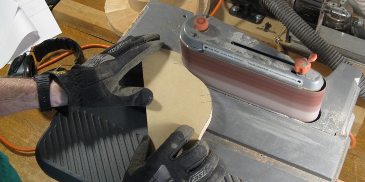 I cut out the base using a bandsaw, and then it was over to the spindle sander to smooth off the edges and get the shape right down to the lines.