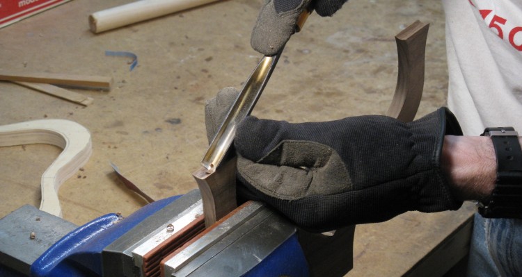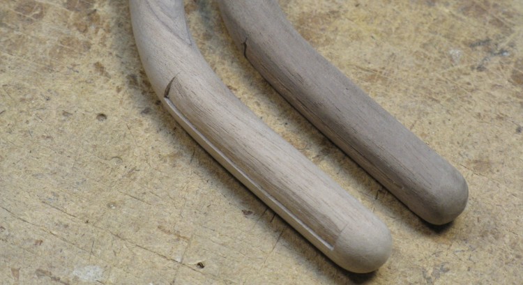 The final step was to add some shallow cutouts in three places along each rail to accept tabs of the sling material. A single layer of the material will wrap over the rail and be glued into each of these cutouts. The depth is appropriate to have the material flush with the wood.