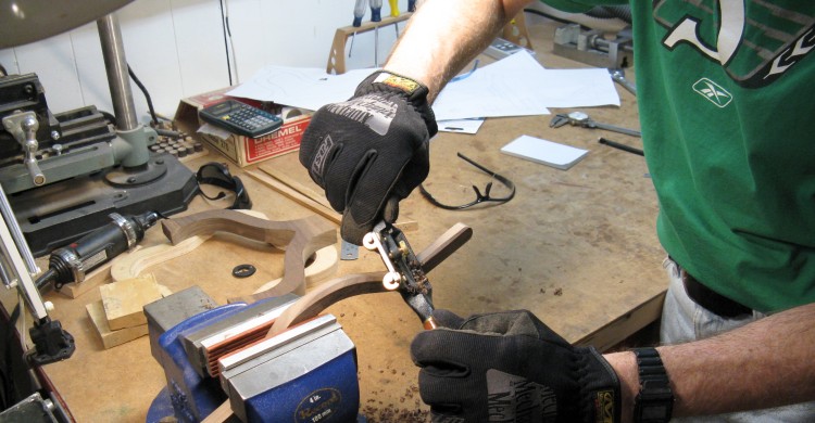 The sling needed to be cut to match the curved profile of the rails which didn't seem like it would be too successful if done freehand. For more consistency, I made an appropriately-curved cutting jig which is being sanded to shape in this photo.