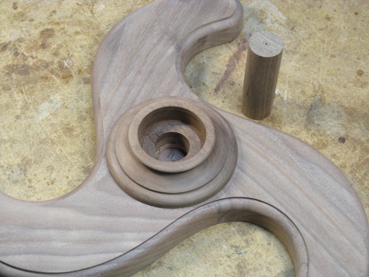 I was a bit concerned about the strength of the base-to-body joint, so I included the supporting dowel shown here. The plinth and base had a 1"-diameter hole drilled most of they way through the base, while the body had been made with a matching 1" hole in the bottom as well.