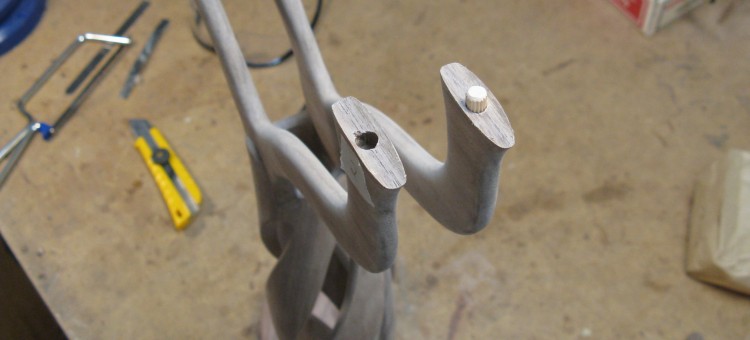 The top of the dowel would be visible through the slots in the body, so (after this photo) it was cut exactly to length and contoured on the top a bit to look a bit less dowely.