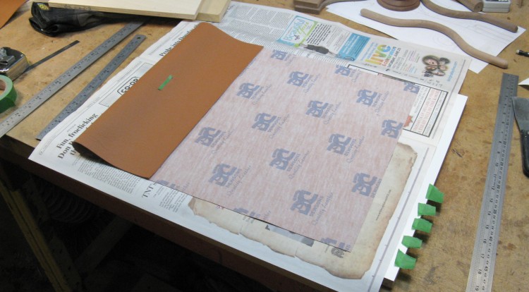 To make the double-sided piece, the seam was taped and the material was folded around an appropriately-sized form to make sure the shape was held after the glue dried. This is the post-gluing piece.