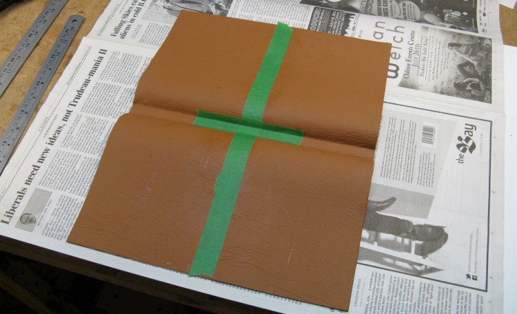 I used a latex fabric cement to glue the tabs of the sling to the rails, hidden here under green tape holding them flat while the glue dries.