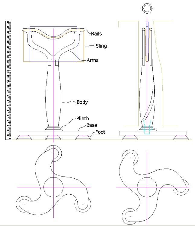 The theory was that it would sit between the chairs (the leathery-colored outlines shown in the plan) and hold the tablet just below the chair arm height. It was designed to have a curious main body, a funky base, offbeat feet and a peculiar holder. Does it work? And with adjectives like that, does it even need to?