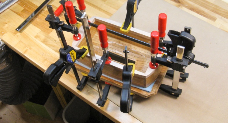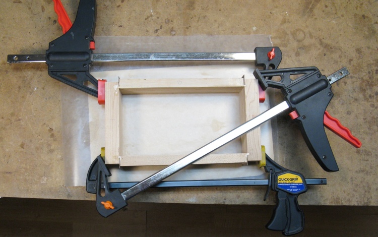 Next step was to glue the four box sides together. The diagonal clamp is holding the box square since it wanted to go together a bit skewed with only the horizontal clamps.